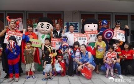 今年4月28日兒童保護日在雲林縣北港文化中心前廣場,由雲林縣議員蔡岳儒和正義化身的有心超人帶著蝙蝠俠...