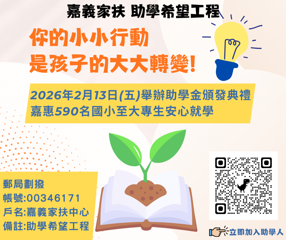 家扶中心主任沈明彥表示,教育是孩子累積自信、翻轉生命的重要關鍵,「助學希望工程」的核心精神,是在孩子最需要的時刻伸出援手,讓他們能安心學習、穩定成長。中心將依學生的社會救助資格,提供不同金額的助學金。本次預計補助大專生130名(每名5,000元、10,000元或20,000元)、高中職生100名(每名5,000元或8,000元)、國中生100名(每名2,000元)及國小生260名(每名1,000元),共計590名學生,助學金總額為235萬5千元,並預計於2月13日辦理助學金典禮,公開頒發大專生助學金。