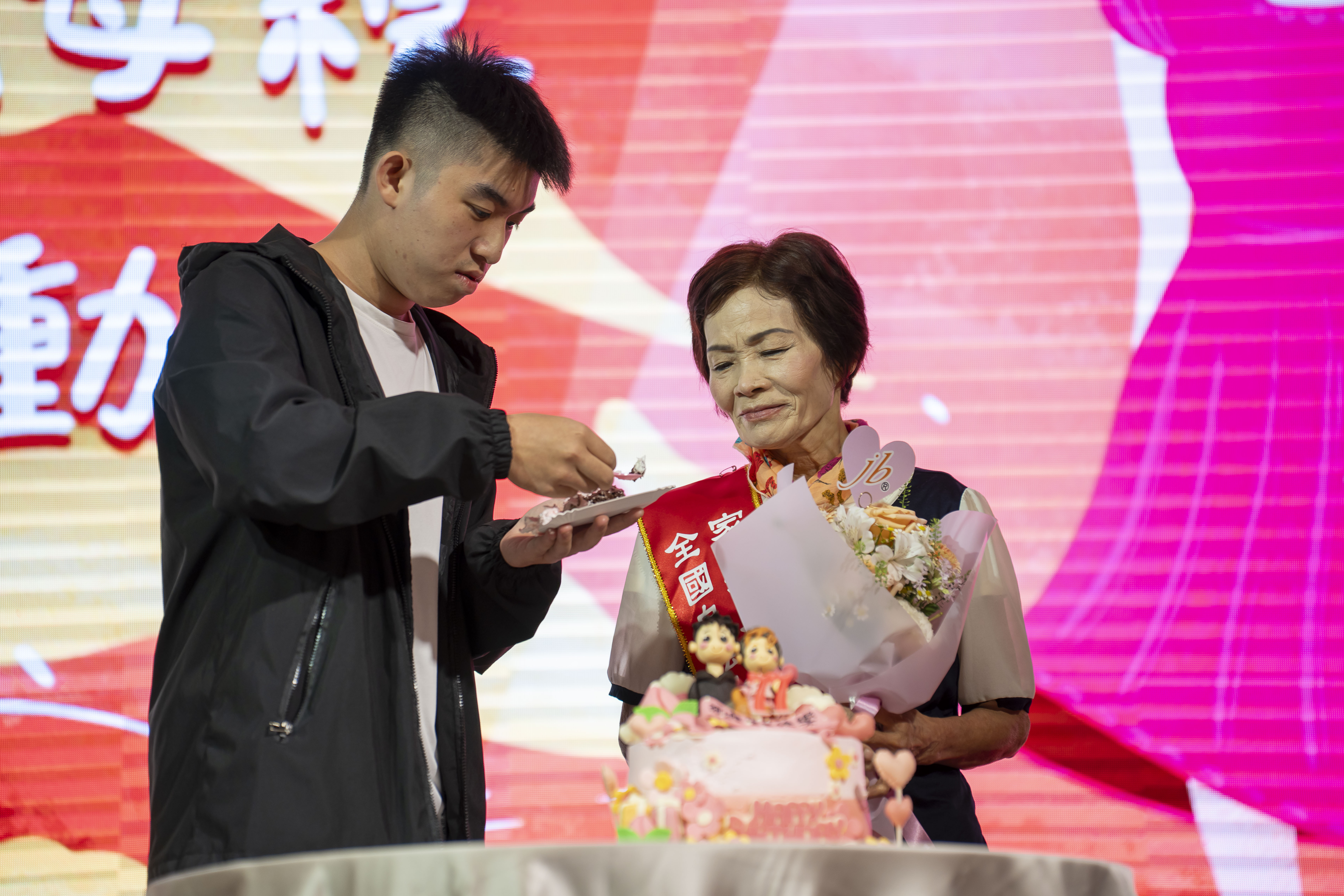 台北77歲的張江香阿嬤,長年為撫養孫子四處奔波,從工地勞動到市場擺攤,即使曾發生從三樓摔到地下二樓的墜落意外,心中牽掛的仍是「孫子該怎麼辦」。她用一雙手撐起家庭,也用一輩子守護孫子的成長。活動當天,現場特別播放孫子彈著吉他、親自朗讀寫給阿嬤的信件影片,字字句句訴說感謝與愛。隨後孫子驚喜端出蛋糕,全場齊聲唱起生日快樂歌,為阿嬤補上一個多年來未曾好好慶祝的生日。面對突如其來的祝福,阿嬤忍不住落淚,這一刻,她成為被愛包圍的主角。
